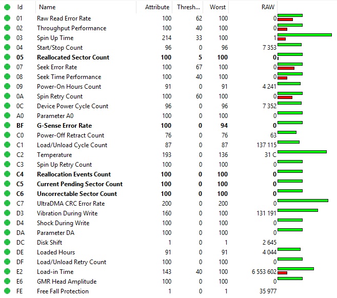 Diska SMART atribūti ir optimāli, bez būtiskām kļūdām.