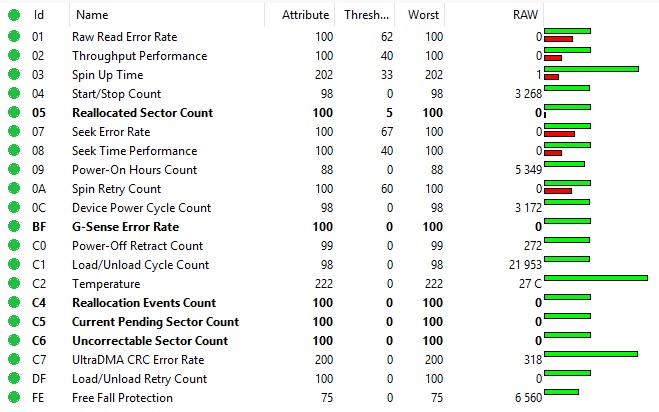 Diska SMART atribūti ir optimāli, bez būtiskām kļūdām.