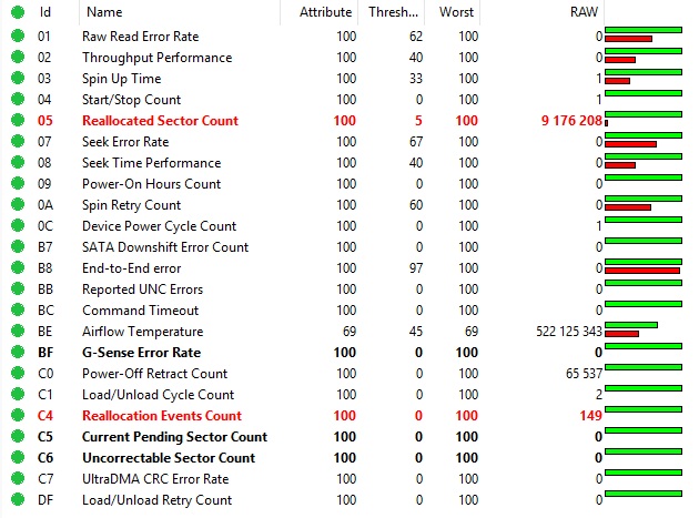 The drive has numerous reallocated blocks; however, the heads read and write correctly. Although its overall health is weakened, it remains suitable for data-recovery purposes.