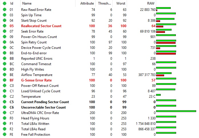 The drive has numerous reallocated blocks; however, the heads read and write correctly. Although its overall health is weakened, it remains suitable for data-recovery purposes.